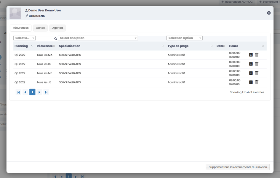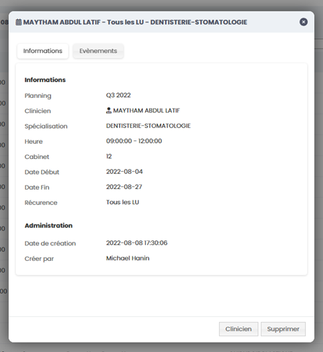 Vous pouvez retrouver les informations sur un clinicien en cliquant sur son nom. Une fenêtre va s’ouvrir avec les différentes récurrences, les évènements AD-HOC du clinicien ainsi que son agenda.