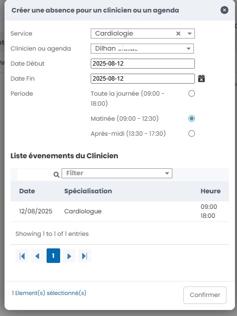 Il ne reste qu’à sélectionner le clinicien et à spécifier les dates d’absence de ce dernier. Cliquez ensuite sur « Créer ».
