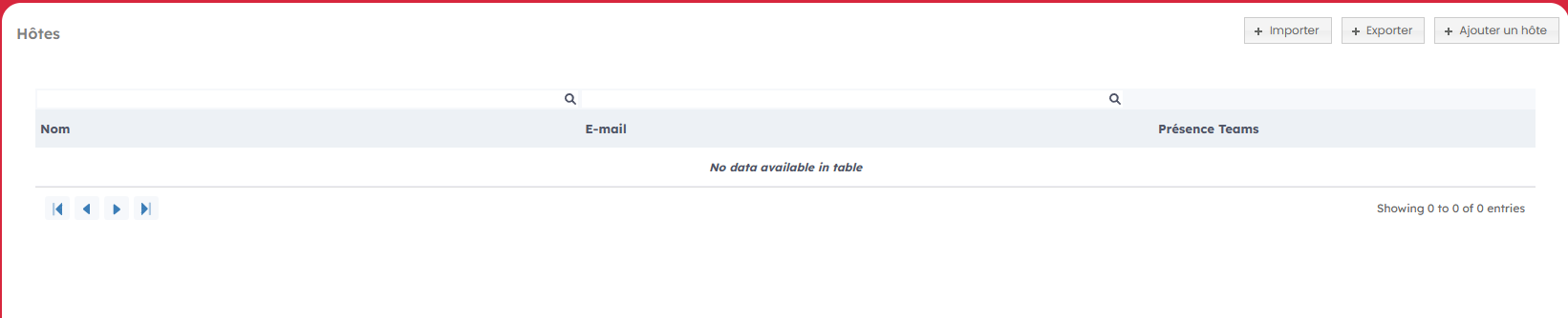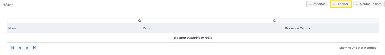 L'onglet "Hôtes" s'affiche avec le détail des hôtes (nom, adresse e-mail, et leur présence sur Teams).