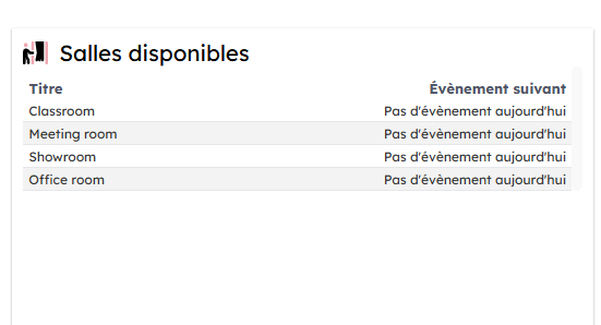Le listing des salles disponibles vous permet d'avoir une première vue sur les salles que vous posséder ainsi que leur disponibilité du jour.
