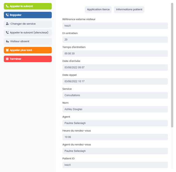 Lorsqu’un visiteur se trouve en entretien, les informations de celui-ci s’affichent à droite des boutons.