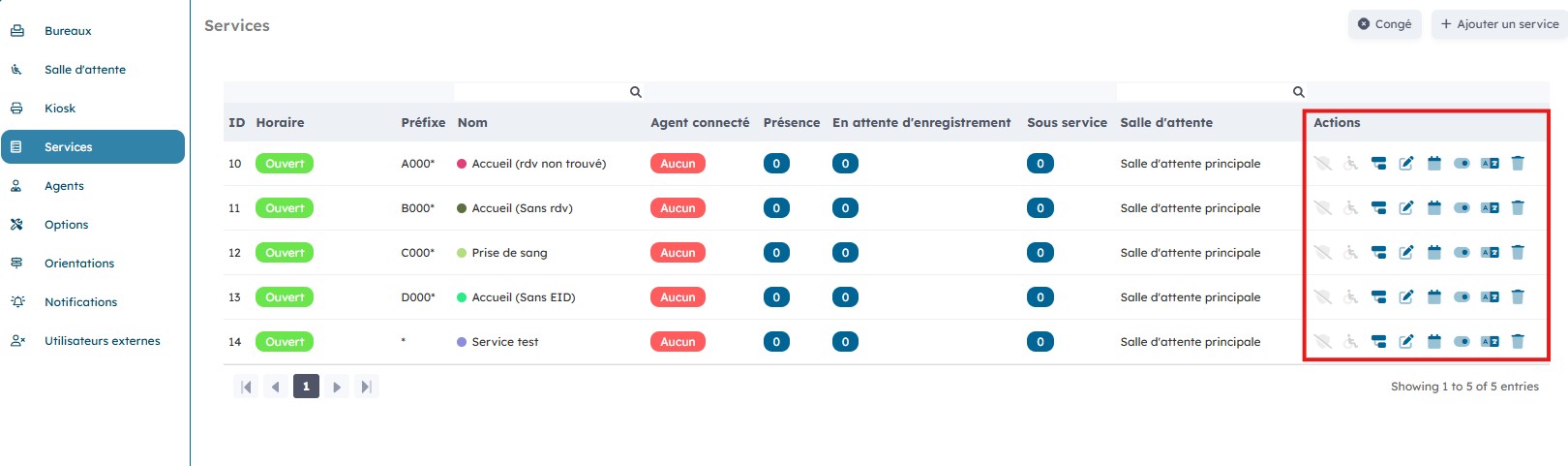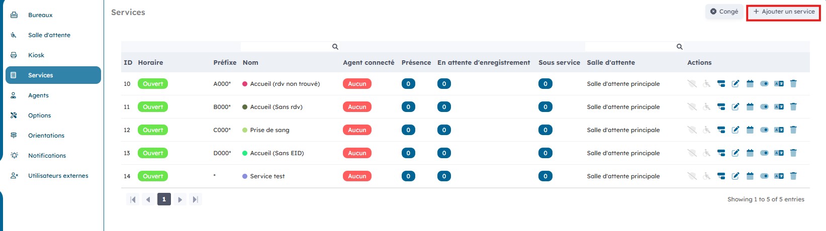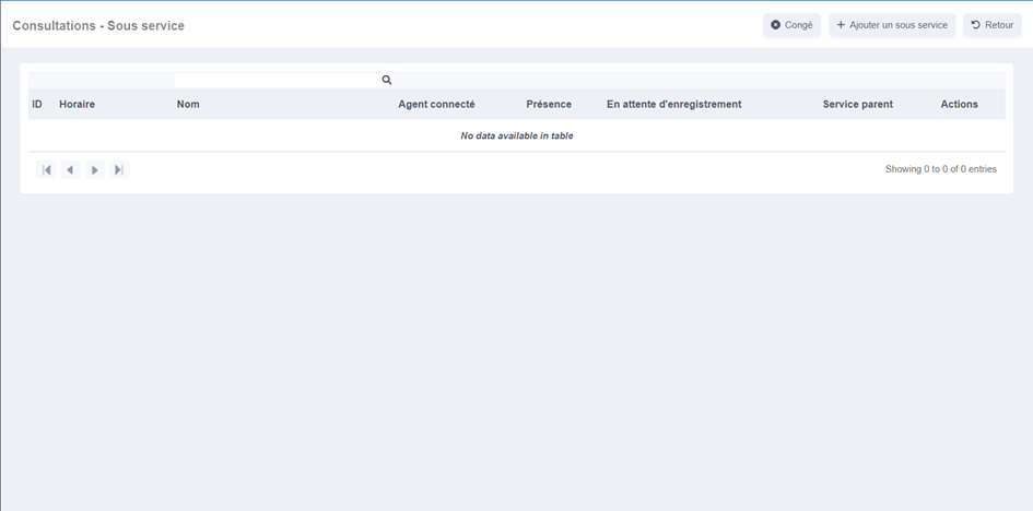 Sur la page « Service » vous avec une vue d’ensemble sur les différents services ainsi que sur le nombre d’agents connectés par service, le nombre de patients présents et ceux en attente d’enregistrement.