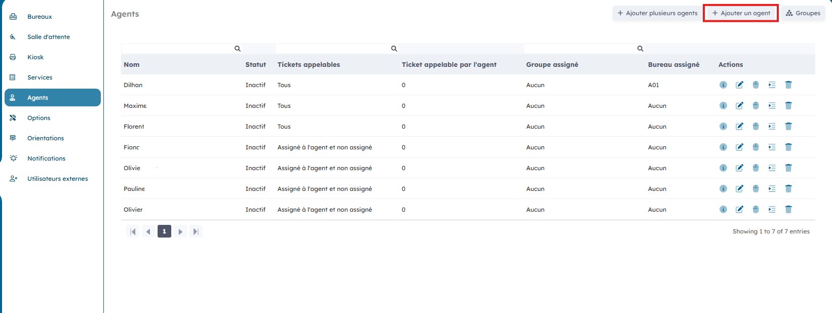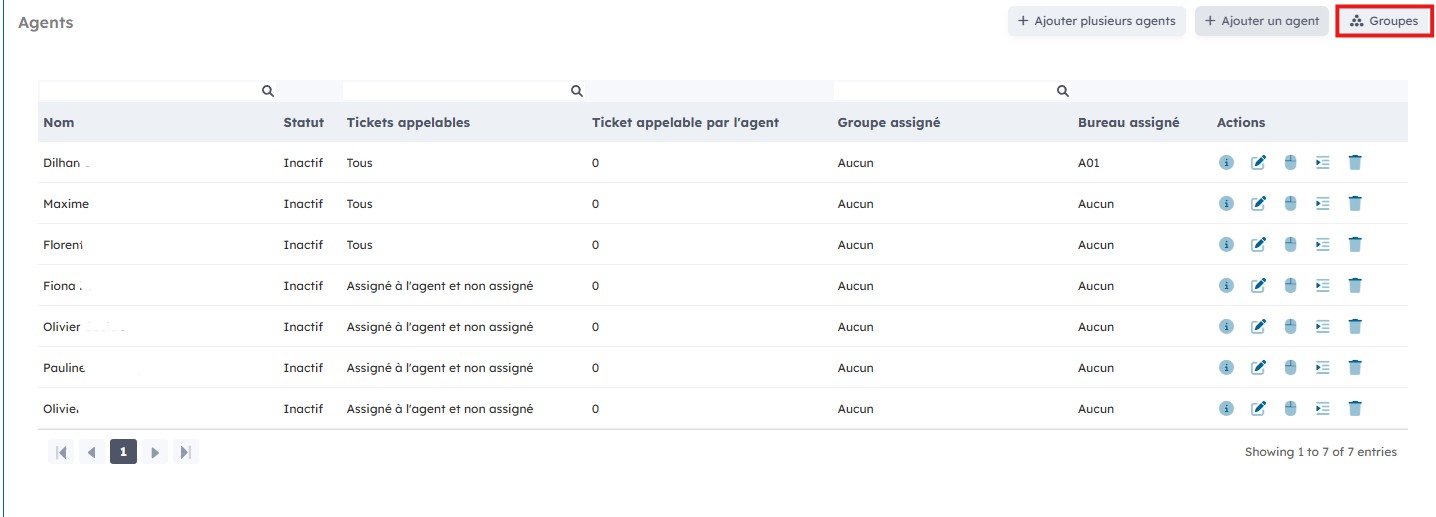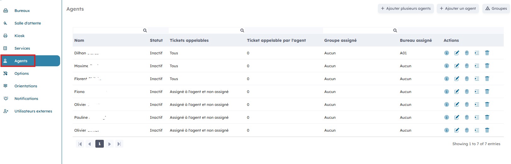 Sur la page « Agents » vous avez une vue d’ensemble sur les différents agents ainsi que sur leur statut, leurs tickets appelables, ainsi que leur groupe et bureau assignés.